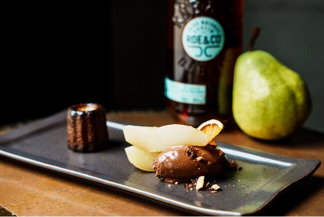 『ROE & CO』とオレンジリキュールをブレンドし注入したウイスキーカヌレと、洋梨のコンポートにオレンジ風味のショコラムースを合わせた期間限定ペアリングプレート。洋梨・熟成に使われるバーボン樽由来のカカオやナッツの風味、そして余韻にほのかに感じるオレンジやライムなどの香りが特徴です。