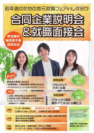 静岡新卒者等人材確保推進本部(静岡労働局、ハローワーク、静岡県等)は、2023年3月卒業予定の大学生等、既卒3年以内の方及び概ね45歳未満の方を対象として、静岡県内に就業地のある約200の企業と直接会うことができる対面形式の合同企業説明会・就職面接会を開催いたします。