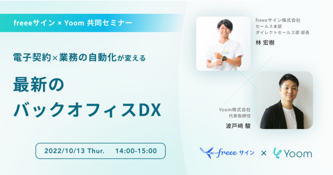 freee株式会社(本社:東京都品川区、CEO:佐々木大輔)のグループ会社であるfreeeサイン株式会社(本社:東京都品川区、代表取締役:鬼頭 政人)が提供する電子契約サービス「freeeサイン」では、2022年10月13日(木)14:00~15:00に、Yoom株式会社と共催でオンライン無料セミナー「電子契約 × 業務の自動化が変える 最新のバックオフィスDX」を開催します。