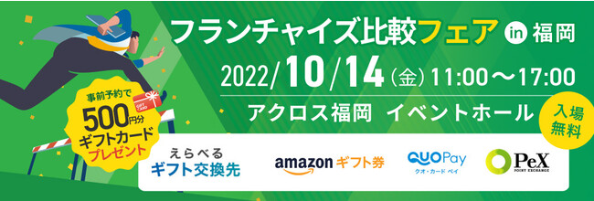 このたびの「フランチャイズ比較フェアin福岡」では、買取・リサイクル、飲食、IT・通信、結婚相談所、不動産など、過去最高の30以上のブランドが出展予定です。オフラインでフランチャイズ本部担当者とコミュニケーションが取れるため、WEB・パンフレットには載っていないリアルな情報収集や自分に合ったフランチャイズの比較検討が叶います。また、フランチャイズ専門家によるセミナーでは、フランチャイズの成功事例のほか、最新の業界動向など、独立・開業に役に立つ有益な情報をお届け。独立前の疑問や不安、本部選びから資金調達まで、フランチャイズにまつわるあらゆるお悩みを専門家に相談可能なブースも設けております。さらに、事前予約の上来場された方には、Amazonギフト券やQUOカードPayなど、選べるデジタルギフト500円分をプレゼントする来場特典をご用意しております(※)。