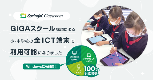 そしてこの度、文部科学省によるGIGAスクール構想により児童・生徒に1人1台のICT端末配備がほぼ実現する中、当たり前にプログラミング“で”学ぶ環境の実現に向けて、Springin’ ClassroomのWindowsへの対応を発表いたします。これまでSpringin’ Classroomでは、「iOS」と「Chromebook」のOS対応となっておりましたが、Windowsでも対応可能となり、小・中学校に配備済みのすべてのICT端末において利用可能となります。