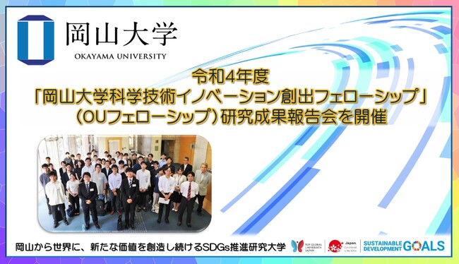 国立大学法人岡山大学(本部:岡山市北区、学長:槇野博史)は2022年9月20日、令和4年度「岡山大学科学技術イノベーション創出フェローシップ」(通称:OUフェローシップ)の研究成果報告会を本学津島キャンパス(岡山市北区)にある創立五十周年記念館で行いました。