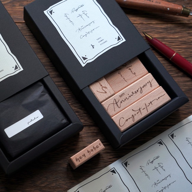 「HAPPY Anniversary」「Congratulation」などのメッセージがセットになった、初心者さんにもおすすめのはんこ。手書き風なので、ぽんっと押すだけで温かみのある雰囲気を演出できます。