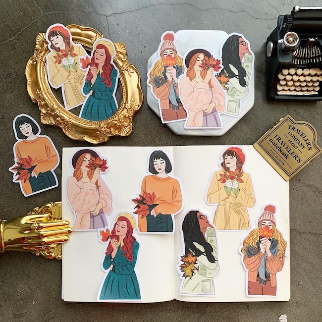 女の子のリアルな表情やおしゃれなファッションが目を引く、タイブランドによるステッカー6枚セット。それぞれが秋色の葉っぱを手にしているので、季節のお便りにもぴったりです。