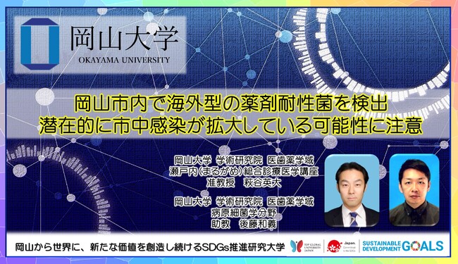 国立大学法人岡山大学(本部:岡山市北区、学長:槇野博史)学術研究院医歯薬学域の萩谷英大准教授(瀬戸内(まるがめ)総合診療医学講座)と後藤和義助教(病原細菌学分野)の研究グループは、岡山市内在住の2人より海外型の薬剤耐性菌(Antimicrobial Resistance; AMR)が検出されたことを明らかにしました。