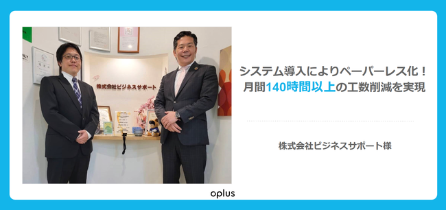 Oplus株式会社(所在地:東京都渋谷区、代表取締役社長:杉原 和樹、以下当社)が管理するブラウザ・スマホ・アプリの全てに対応したシフト・勤怠管理DXサービス「oplus(オプラス)」が、株式会社ビジネスサポート(本社:愛知県名古屋市、代表取締役:今枝 弘之、以下ビジネスサポート)に導入され、出勤簿のペーパーレス化を実現し勤怠管理と給与計算の作業工数を140時間以上削減したことをお知らせします。