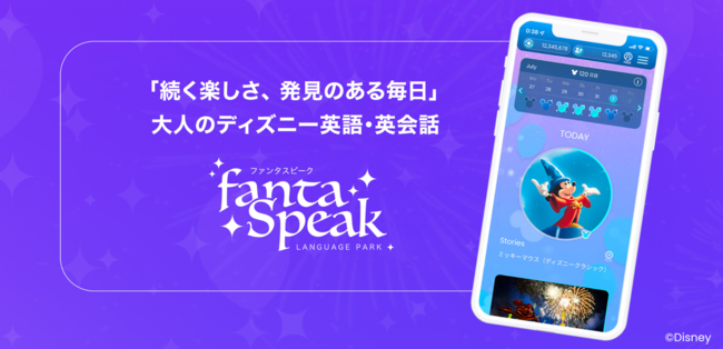 「ディズニー fantaSpeak」のコンセプトは「続く楽しさ、発見のある毎日」。魅力あふれるディズニー&ピクサー作品のコンテンツと様々な仕組みで、学びの習慣化や豊かなライフスタイルの実現をお手伝いします。「英語ができるようになりたいけど、勉強がなかなか続かない…」「何から始めていいかわからない…」といった悩みを持つ方のための英語学習サービスとなっており、ご利用を継続いただくことで映画を字幕なしで見たり、英会話ができる喜びも味わえるカリキュラムを提供いたします。なお、本サービスは、ディズニーおよびピクサー作品による大人向けの英語学習アプリとして、世界で初めてとなります。