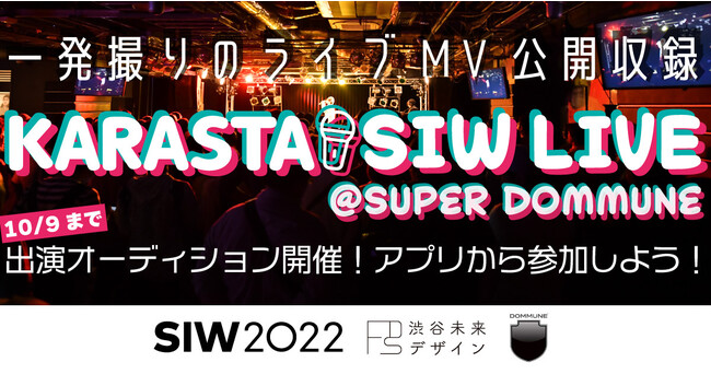 新たなアイデアと触れ合う特別なイベントにて、KARASTAが主催するライブMV公開イベントが開催され、本イベントの出場権3枠(合計3組)をかけたオーディションのエントリーが10月1日(土)より開始します。オーディションのエントリーは、お気に入りの歌を歌った動画を撮影して、「#SIWオーディション」をつけて投稿すると応募できます。