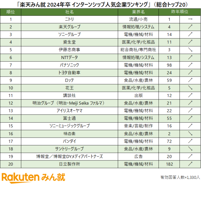 ■「楽天みん就 2024年卒 インターンシップ人気企業ランキング」結果概要(総合トップ20)