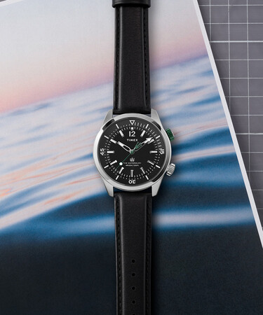 TIMEXの創業地かつ創業時の社名でもあるウォーターベリークロックカンパニーの名を冠したウォーターベリーシリーズから、「コンプレッサーケース」と呼ばれるインナー回転ベゼルを備えた「ウォーターベリーダイバー」が登場します。蓄光素材を配したアプライドインデックスや15分計のインナーベゼル、根元にWを象った秒針など、TIMEXの170年弱に渡る時計製造の矜持を感じさせるディテールを随所に施しています。インナーベゼルを採用することでエレガントな見た目を実現。秒針と2時位置のリューズに配した落ち着いたグリーンのアクセントカラーが華を添えます。100m防水。