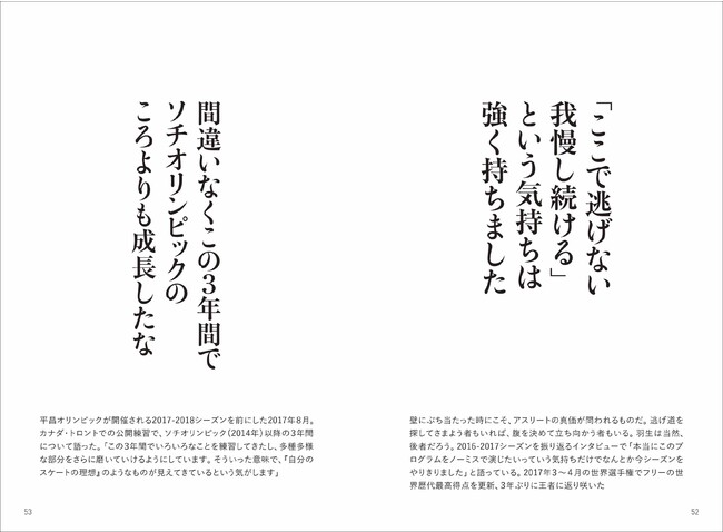 その輝かしい戦績とともに、人々を魅了してやまないのが、羽生結弦選手の「言葉」です。記者会見やインタビューで語られる「言葉」は、けして美しく輝いてばかりではなく、ときに葛藤や苦しみを吐露し、泥臭さすら感じさせます。「絶対王者」としてフィギュアスケート界に君臨した羽生選手の、そんな真摯で率直で人間らしい「言葉」に、私たちの心は動かされるのです。
