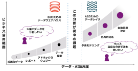 ※企業におけるデータ・AI活用度とビジネス活用範囲を示した曲線。従来のデータウェアハウス・データレイクではプラットフォーム間に分断が発生していた。