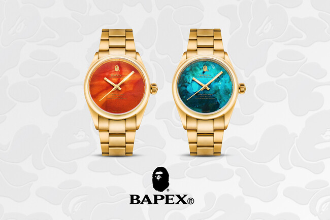 今回発売されるBAPEX(R)はゴールドを基調とし、文字盤にストーンパターンをあしらったデザインが特徴のモデルです。