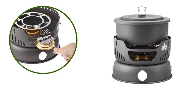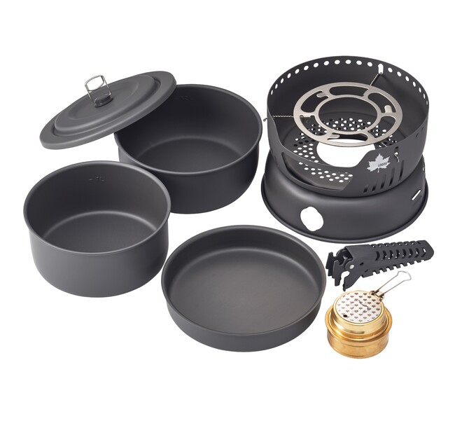 ファミリーキャンプに最適なセット、アルコールバーナーに、大鍋、小鍋、フライパンの3種類のクッカーと専用コンロ付き。様々な調理方法に対応できるので、1セットあれば幅広い調理が楽しめる。
