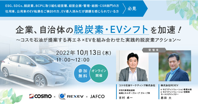 株式会社REXEVは、コスモ石油マーケティング株式会社およびジャフコ グループ株式会社共催で、無料ウェビナー「企業、自治体の脱炭素・EVシフトを加速!~コスモ石油が提案する再エネ×EVを組み合わせた実践的脱炭素アクション~」を開催します。