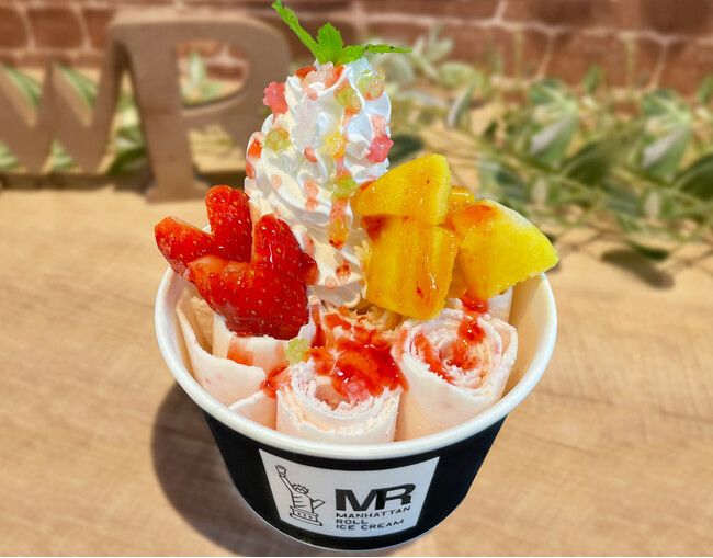 ロールアイスとは、マイナス20度以下のコールドプレートの上に、液状のアイスベースを乗せ、固まったものを薄く伸ばして丸めたアイスの事です。当店では、オリジナルのアイスベースに、様々なフルーツやチョコなどを追加することで、多様なメニューをご用意しております。味のベースとなるアイスにもこだわり、一般的なアイスに使われている卵を使用せず、店舗にて牛乳、生クリーム、シロップを独自の配合で合わせる事で、滑らかで濃厚なのに、甘すぎないアイスクリームを実現。またトッピングやアイスのベースには、フレッシュフルーツ(冷凍ではないもの)を使用する等、見るだけでなく味でもしっかり満足して頂けます。