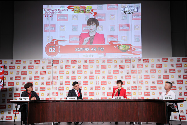 ZUBAAAN!の新味を考えるコーナーでは一般視聴者からもYouTubeのチャット欄で意見を募りました。米倉さんは「家系」、飯田さんは「佐賀とんこつ」、大和さんは「ブラック(富山)」、早稲田大学ラーメン部は「博多風豚骨」とそれぞれの食べたい新味を発表。登壇者による投票の結果、“ZUBAAAN!新味”は米倉さんの「家系」に決定!第4の「マルちゃんZUBAAAN!」誕生なるか?スタジオ中がそんな期待に包まれました。