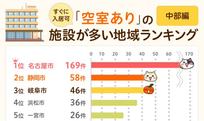 テキスト版、すぐに入居できる「空室あり」の施設が多い地域ランキング 【中部編】