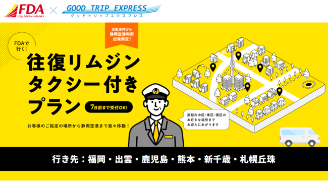 株式会社フジドリームエアラインズ(略称:FDA、本社:静岡県静岡市、代表取締役社長:楠瀬 俊一)は、主に浜松市内から富士山静岡空港発着のFDA便を利用してご旅行される方を対象に「静岡空港リムジンタクシー」と航空券、宿泊付きの旅行プランを、旅行会社と共同で企画し、販売を開始しました。