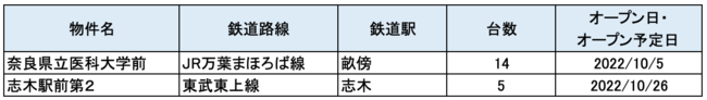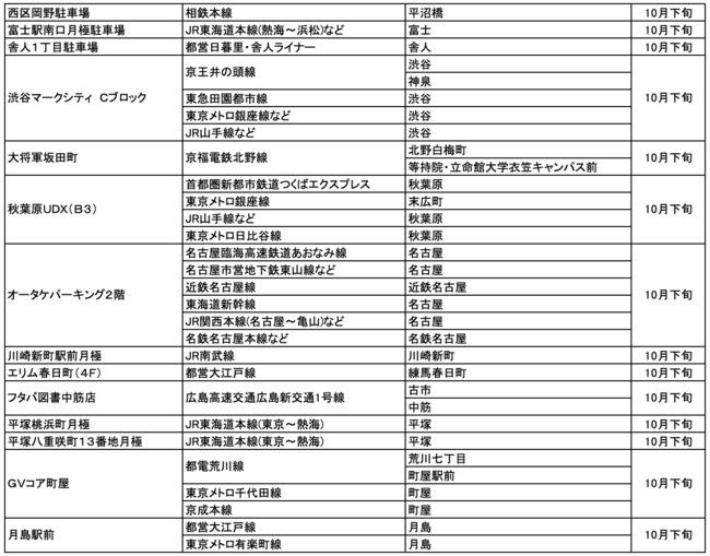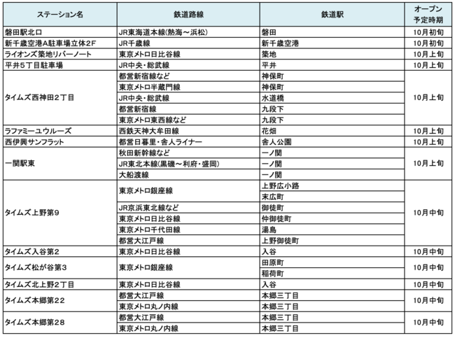 10月にオープンおよびオープン予定の「パーク&ライド」が可能な駐車場は2件、「レール&カーシェア」が可能なステーションは44件です。