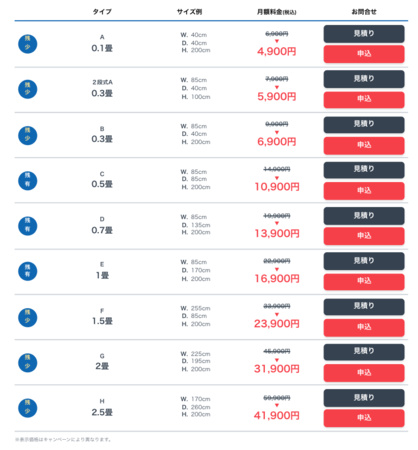 部屋タイプとサイズ、月額料金はこちら