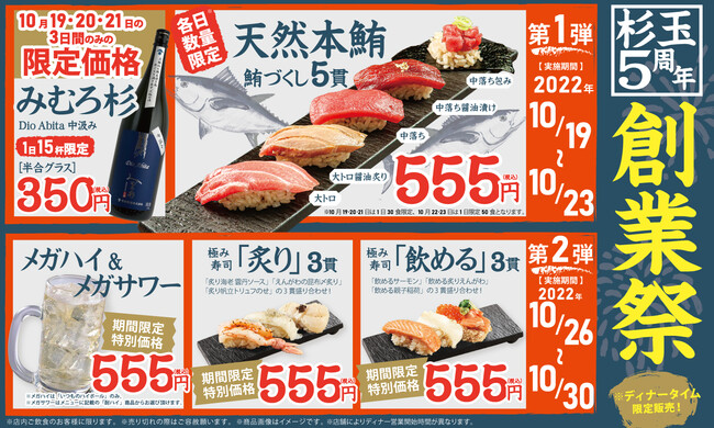 10月26日(水)からは創業祭第2弾として、人気の極み寿司を3種類味わえる3貫セットが登場いたします。また同日より、ハイボールとサワーのメガサイズをいつもよりお得な555円(税込)でお楽しみいただけます。