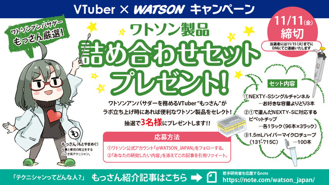 神戸を拠点にライフサイエンスラボ用品を製造する深江化成株式会社は、10/11から、フォロー&リツイートで「詰め合わせセットの無料プレゼント」を開始いたします。独立して研究室をもつときに初期投資がほとんどできないというユーザー(WATSONアンバサダー)の声を聞き、研究を始めやすいセット商品で環境を整えてもらいたいという思いでこのキャンペーンを企画。noteでこのキャンペーンにいたった経緯などを記事にし、テクニシャンの方々の声などを集めていく予定です。