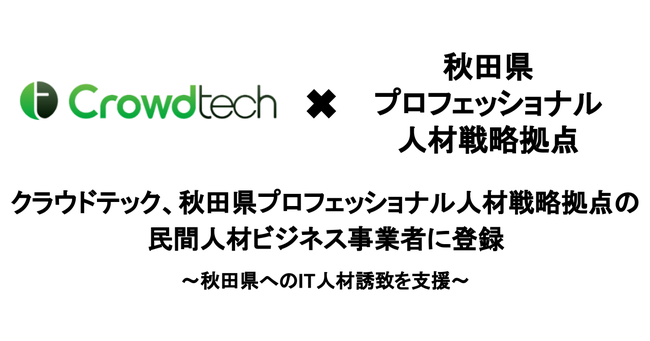 企業と個人をつなぐオンライン人材マッチングプラットフォームを開発・運営する株式会社クラウドワークス(本社:東京都渋谷区 代表取締役社長 兼 CEO:吉田 浩一郎 以下「当社」)が運営するフリーランス向けエージェントマッチングサービス「クラウドテック」は、秋田県プロフェッショナル人材戦略拠点の民間人材ビジネス事業者に登録しました。これにより、秋田県内企業へのIT人材誘致を支援します。