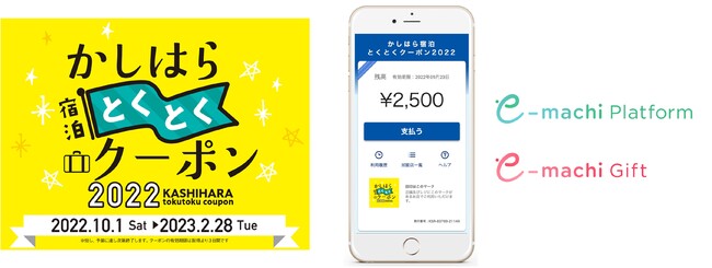 eギフトプラットフォーム事業(※1)を展開する株式会社ギフティ(本社:東京都品川区/代表取締役:太田 睦、鈴木 達哉/以下、ギフティ)は、自治体・地域の課題を解決するデジタルプラットフォーム「e街プラットフォーム(R)」を、市内の宿泊と現地消費を促し観光振興を図ることを目的に奈良県橿原市が実施する「かしはら宿泊とくとくクーポン」キャンペーンに、採用いただきました。これに伴い、2022年10月1日(土)から2023年2月28日(火)の期間中に本キャンペーンにお申込みされた方々を対象に付与する、電子クーポン「かしはら宿泊とくとくクーポン」が、本プラットフォームの基本ソリューションである「e街ギフト(R)」(※2)を介し2022年10月1日(土)より発行開始されましたので、お知らせいたします。なお、本案件は2021年5月より実施された「奈良Go To Eatキャンペーン」で奈良県に採用いただいた「e街プラットフォーム(R)」の仕組みをマルチユースしたものです。また、ギフティは、橿原市より本事業を受託した一般社団法人橿原市観光協会(所在地:奈良県橿原市/会長:中谷 昌紀)と連携のもと、「e街プラットフォーム(R)」の提供を行っております。