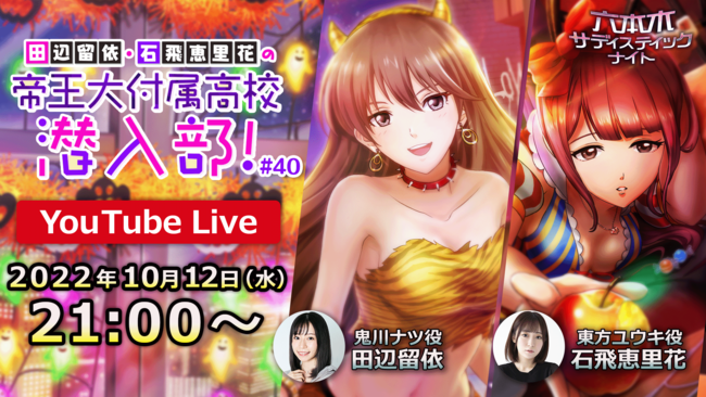 ゲームアプリ「六本木サディスティックナイト」公式YouTube番組 田辺留依・石飛恵里花の帝王大附属高校潜入部!#40 10月12日(水)21:00より生配信決定!ハロウィンコスプレでお届け