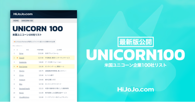 非上場スタートアップ投資プラットフォームのHiJoJo Partners株式会社(本社:東京都港区、代表取締役:スピリドン・メンザス、以下HiJoJo Partners)は、米国に本拠を置くユニコーン企業(*1)を企業評価額順に100社リストアップした米国ユニコーン企業100社リスト「UNICORN100」の最新版をHiJoJo Partnersの投資家向け情報サイト「HiJoJo.com(https://www.hijojo.com/)」で公開しました。