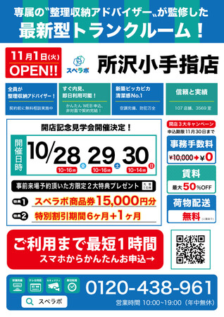 【11月1日(火)オープン】見学から契約、解約まで完全非接触・非対面、お申し込みからご利用まで最短1時間!絶賛運営中のトランクルーム【スペラボ】が埼玉県所沢市小手指に出店!