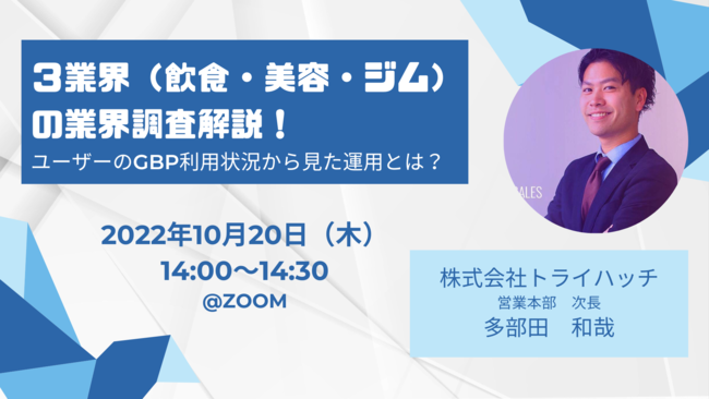 株式会社トライハッチ(所在地:東京都新宿区、代表取締役:武藤 尭行)は「飲食・美容・ジム業界の利用調査結果を解説!ユーザー行動から導き出すGoogleビジネスプロフィール運用の最適解とは?」のWebセミナーを10月20日(木)14:00~14:30に開催いたします。