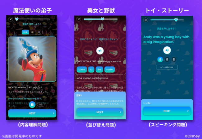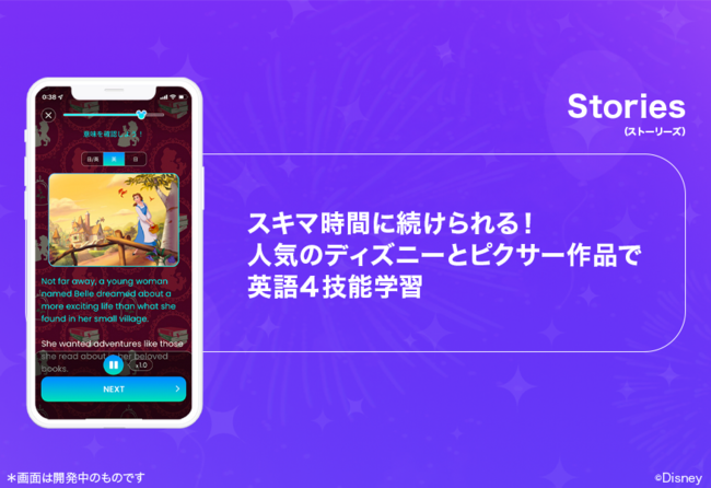 ディズニーとピクサー作品で英語4技能を学ぶメイン学習コーナー「Stories(ストーリーズ)」では、プレリリース版において「魔法使いの弟子」「美女と野獣」「トイ・ストーリー」の人気3作品をお届けいたします。