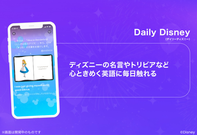 コンセプトは「続く楽しさ、発見のある毎日」。魅力あふれるディズニーとピクサー作品のコンテンツと様々な仕組みで、学びの習慣化や豊かなライフスタイルの実現をお手伝いします。「英語ができるようになりたいけど、勉強がなかなか続かない…」「何から始めていいかわからない…」といった悩みを持つ方のための英語学習サービスとなっており、ご利用を継続いただくことで映画を字幕なしで見たり、英会話ができる喜びも味わえるようなカリキュラムを提供いたします。なお、本サービスは、ディズニーとピクサー作品による大人向けの英語学習アプリとしては、世界で初めてとなります。
