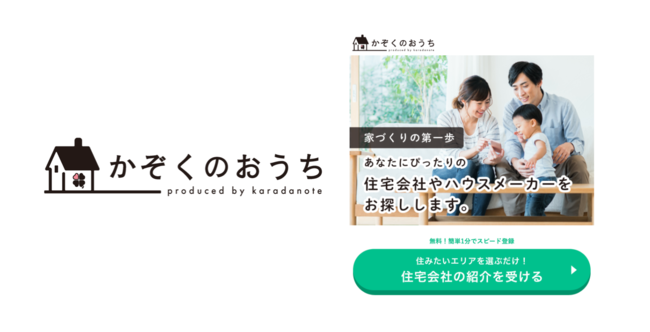 『かぞくのおうち』は、出産や育児などのライフスタイルの変化に伴い、住宅の住み替えを検討する子育て世代を対象に、住みたい地域の住宅会社を効率的に紹介・情報収集ができ、自分にぴったりのハウスメーカーを探せるWEBサービスです。