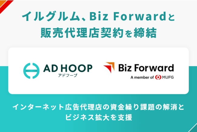 株式会社イルグルム(本社:大阪府大阪市北区 代表取締役:岩田 進、以下「イルグルム」)はオンラインファクタリング事業及び請求代行事業を展開する株式会社Biz Forward(本社:東京都港区 代表取締役:冨山 直道、以下「Biz Forward」)と販売代理店契約を締結したことをお知らせいたします。