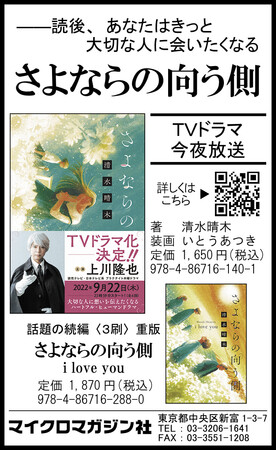 マイクロマガジン社(東京都中央区)は、『さよならの向う側』『さよならの向う側 i love you』を10月13日の朝日新聞に掲載いたしました。