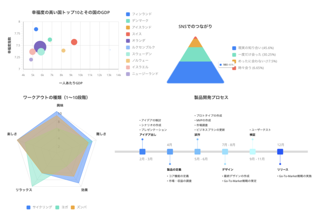これまでCacooのグラフ機能では、表計算ソフトを使用しなくても、Cacooのアプリケーション上で「棒グラフ」や「折線グラフ」をはじめとした7種類のグラフテンプレートを使用することができました。今回新たに「散布図」や「レーダーチャート」等、12種類のグラフテンプレートが追加されたことで、専門スキルがなくても、簡単にデザイン性の高いグラフを作成することができ、多様なデータの可視化、ビジネスシーンでの作図表現の幅を広げていただけます。