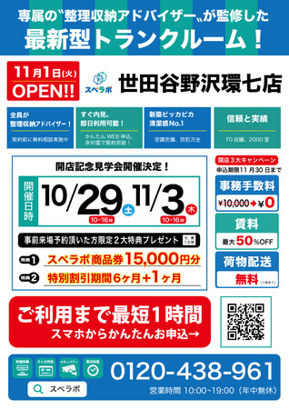 オープンに合わせ10月29日(土)、11月3日(木)に見学会を実施しますので、ぜひ【スペラボ・世田谷野沢環七店】にお越しくださいませ。