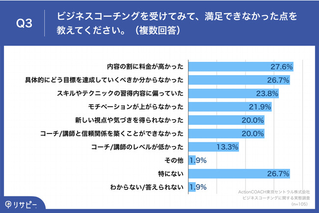 「Q3.ビジネスコーチングを受けてみて、満足できなかった点を教えてください。(複数回答)」(n=105)と質問したところ、「内容の割に料金が高かった」が27.6%、「具体的にどう目標を達成していくべきか分からなかった」が26.7%、「特にない」が26.7%という回答となりました。