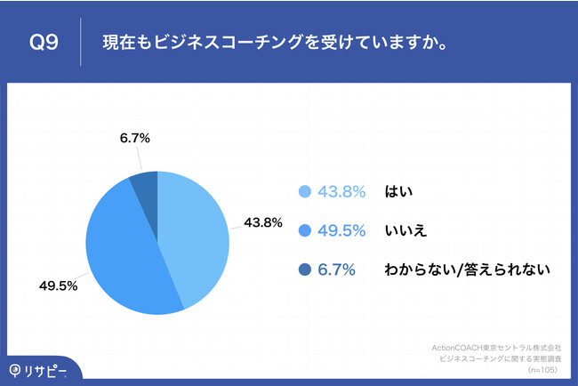 「Q9.現在もビジネスコーチングを受けていますか。」(n=105)と質問したところ、「はい」が43.8%、「いいえ」が49.5%という回答となりました。