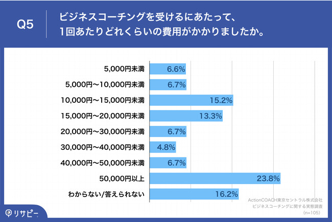 「Q5.ビジネスコーチングを受けるにあたって、1回あたりどれくらいの費用がかかりましたか。」(n=105)と質問したところ、「50,000円以上」が23.8%、「10,000円~15,000円未満」が15.2%という回答となりました。