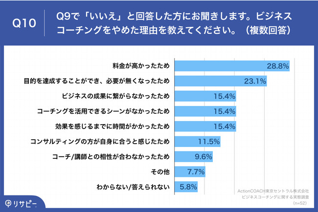 Q9で「いいえ」と回答した方に、「Q10.ビジネスコーチングをやめた理由を教えてください。(複数回答)」(n=52)と質問したところ、「料金が高かったため」が28.8%、「目的を達成することができ、必要が無くなったため」が23.1%という回答となりました。