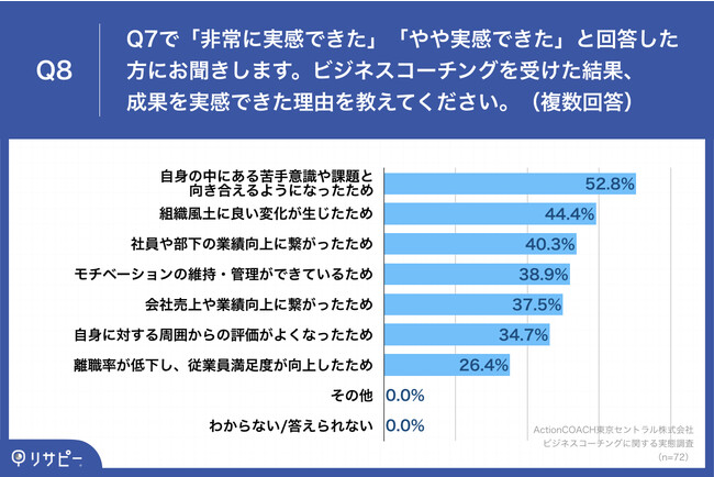 Q7で「非常に実感できた」「やや実感できた」と回答した方に、「Q8.ビジネスコーチングを受けた結果、成果を実感できた理由を教えてください。(複数回答)」(n=72)と質問したところ、「自身の中にある苦手意識や課題と向き合えるようになったため」が52.8%、「組織風土に良い変化が生じたため」が44.4%、「社員や部下の業績向上に繋がったため」が40.3%という回答となりました。