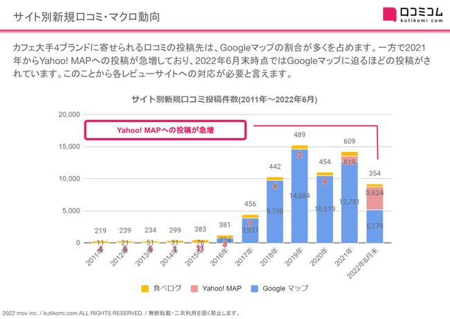 カフェ大手4ブランドに寄せられる口コミの投稿先は、Googleマップの割合が多くを占めます。一方で2021年からYahoo! MAPへの投稿が急増しており、2022年6月末時点ではGoogleマップに迫るほどの投稿がされています。このことから各レビューサイトへの対応が必要と言えます。