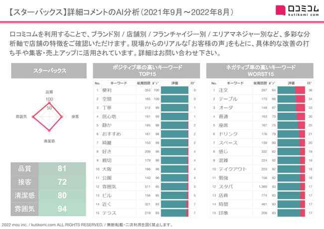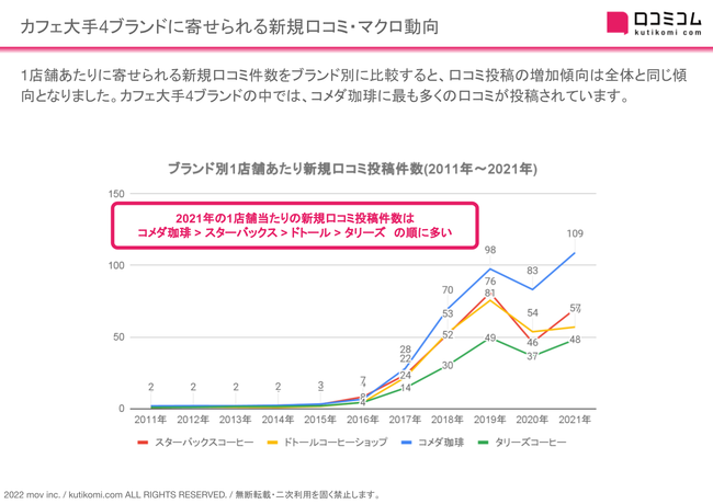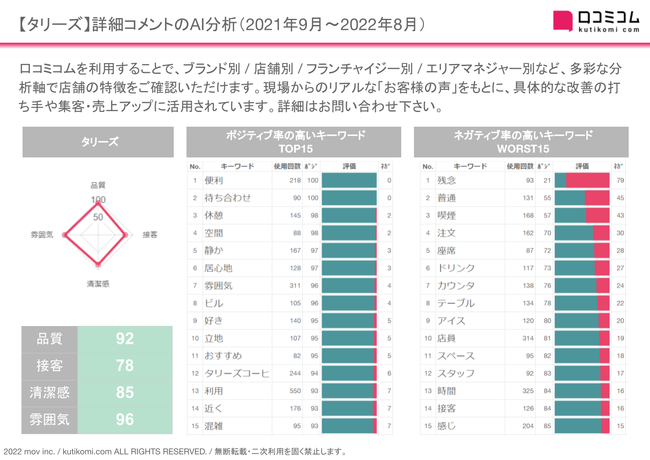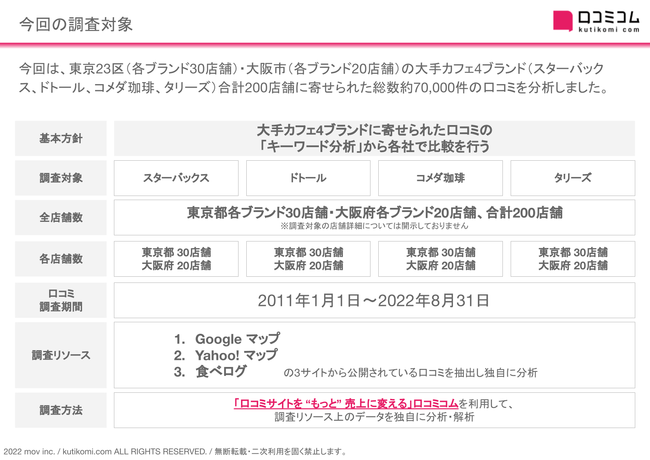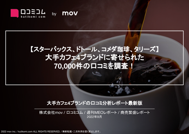 口コミサイトを”もっと”売上に変える、AI店舗支援SaaS『口コミコム』を運営する株式会社mov(代表取締役:渡邊 誠、本社:東京都渋谷区、以下mov)は、『口コミコム』の分析機能を用いてレポートを作成しています。今回は大手カフェ4ブランド(スターバックス、ドトール、コメダ珈琲、タリーズ)各50店舗、合計200店舗の口コミ(総数約70,000件)を分析し、ブランド間での比較を行いました。