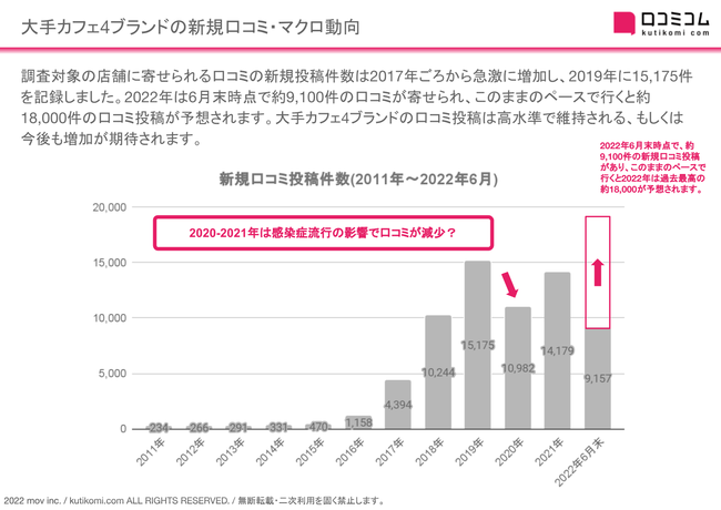 調査対象の店舗に寄せられる口コミの新規投稿件数は2017年ごろから急激に増加し、2019年に15,175件を記録しました。2022年は6月末時点で約9,100件の口コミが寄せられ、このままのペースで行くと約18,000件の口コミ投稿が予想されます。大手カフェ4ブランドの口コミ投稿は高水準で維持される、もしくは今後も増加が期待されます。