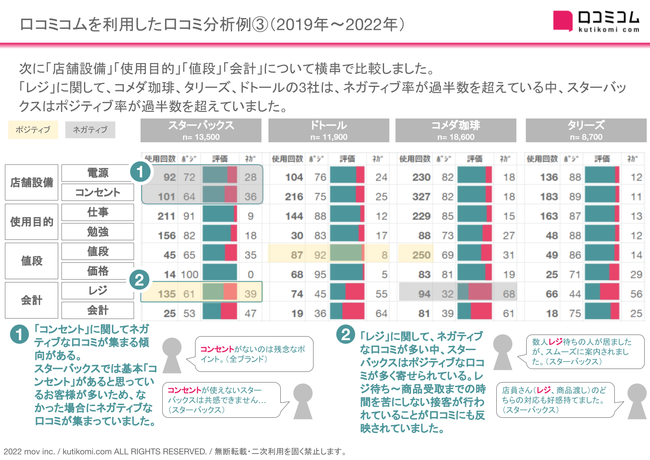 その他、「店舗設備」「使用目的」「値段」「会計」についての口コミを横串で比較した「戦略キーワード分析」については、ネガティブな口コミになりやすいキーワードをポジティブな口コミに変えているスターバックスの企業努力が見えてきます。詳細レポートをダウンロードして是非、ご確認下さい。