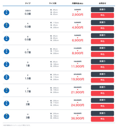 部屋タイプとサイズ、月額料金はこちら